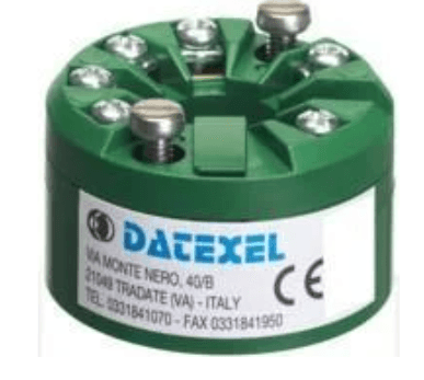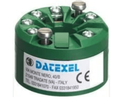 Acondicionador de señal Datexel modelo DAT1120-1, para montaje en cabezal DINB, entrada termocupla J ó K, salida 4-20 mA dos hilos, rango ajustable.