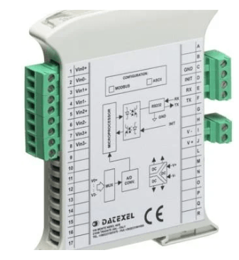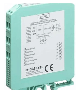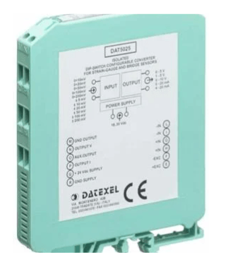 Acondicionador de señal para celda de carga Datexel DAT 5025, configurable por DIP switch, salida 4/20 mA. / 0/10 V., para montar en riel DIN, alimentación 18 a 30 Vcc.